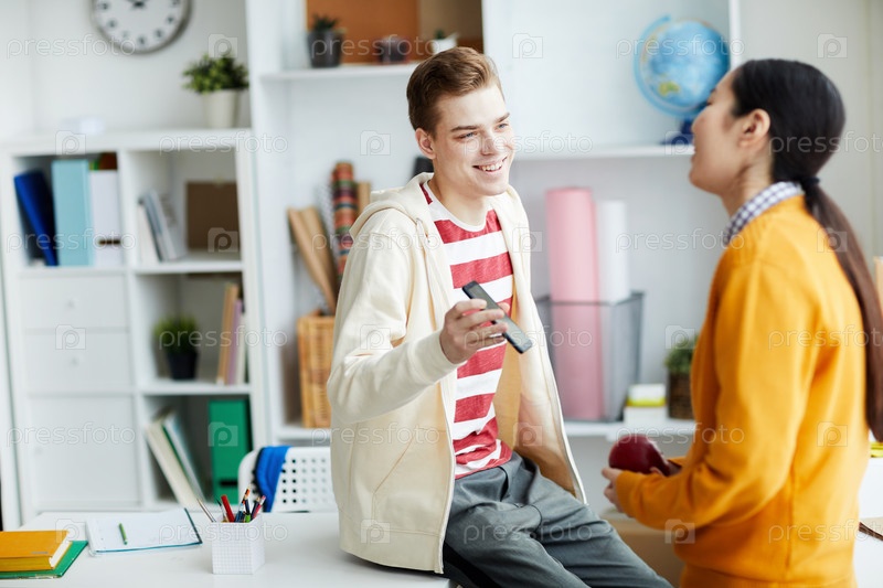 Веселые, взволнованные многоэтнические студенты в обычной одежде смотрят видео в интернете: улыбающийся парень сидит за столом и показывает фотографию другу