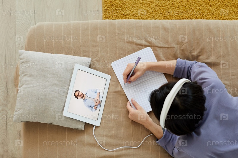 Вид сверху женщины в наушниках, лежащей на кровати и делающей заметки при использовании планшета для просмотра веб-семинара о личном росте