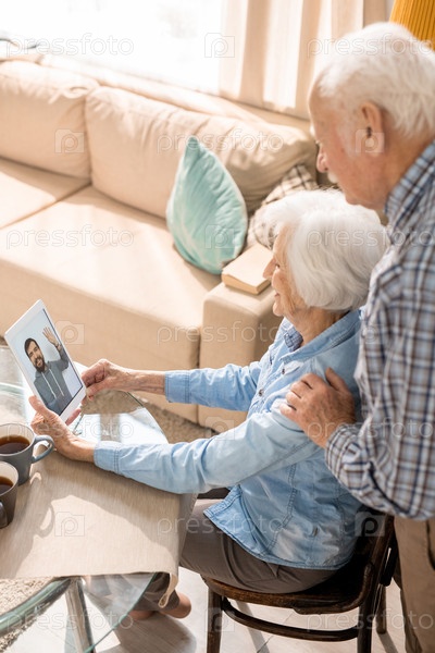 Пожилая пара использует видеочат, чтобы поговорить с семьей