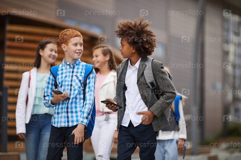 Школьники, использующие телефон на улице