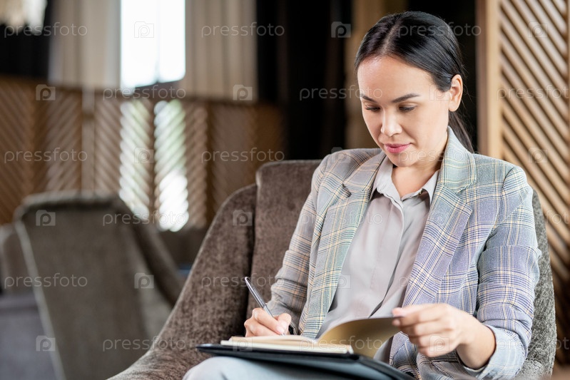 Молодой серьезный учитель сидит в кафе во время перерыва и проверяет документы студентов