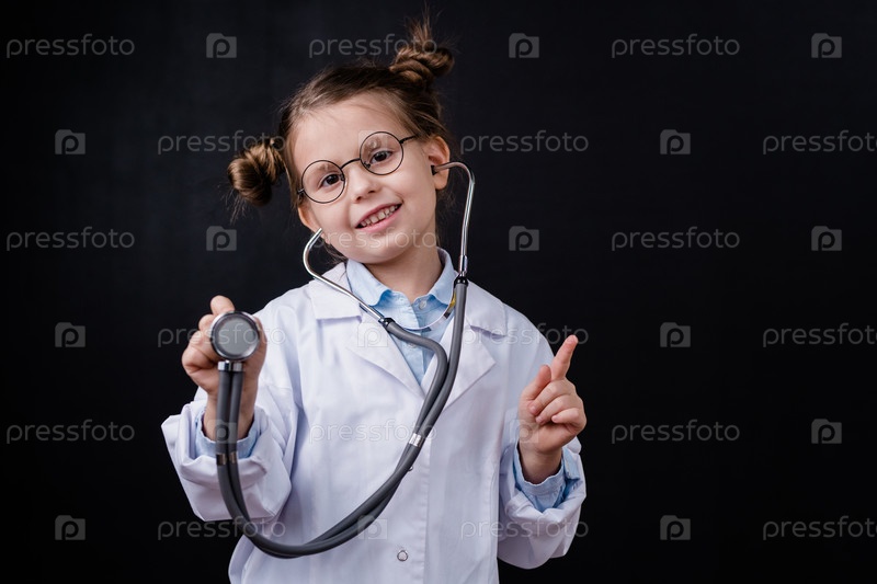 Веселая маленькая девочка в белом халате использует стетоскоп, показывая на тебя