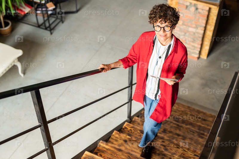 Молодой элегантный дизайнер моды поднимается наверх и смотрит на тебя