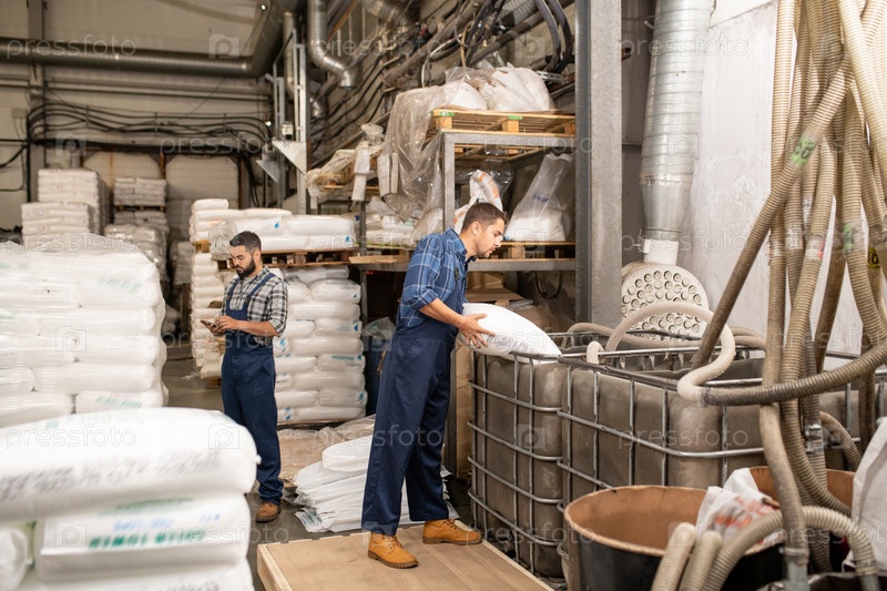 Молодые рабочие крупных фабрик рассыпают полимерные зерна в огромный контейнер