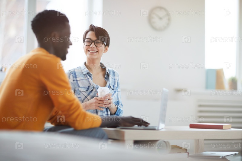 Улыбающаяся молодая женщина разговаривает с коллегой в офисе