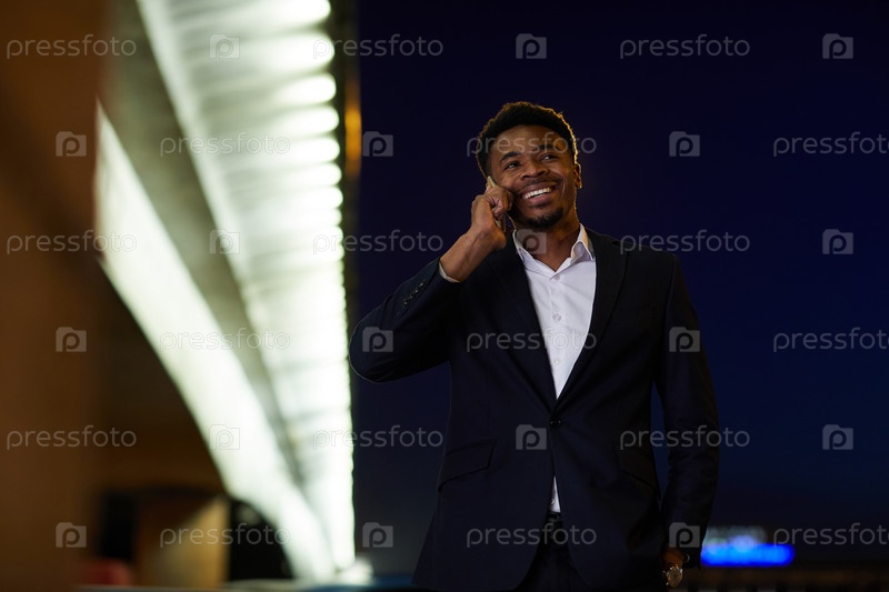 Улыбающийся красивый молодой чернокожий бизнесмен в костюме мобилизуется по улице и общается на сотовом телефоне, возвращаясь домой ночью