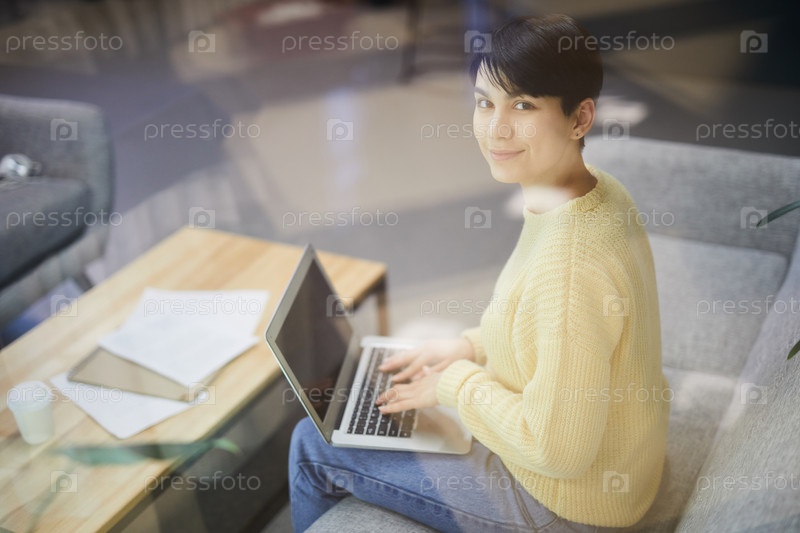 Контент-леди фрилансер, работающая в гостиничном лобби