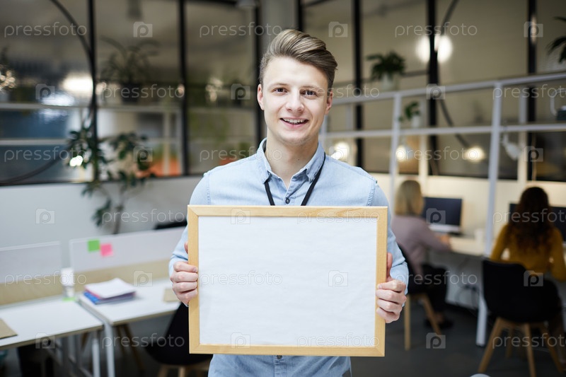 Оптимистичный молодой сотрудник, представляющий информацию на баннере