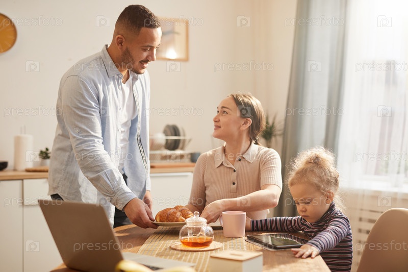 Семья, использующая гаджеты на завтрак в уютной современной кухне