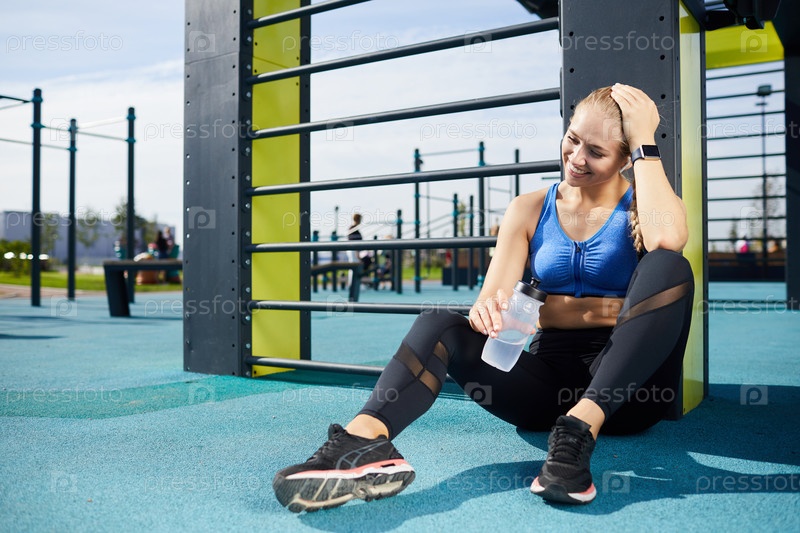 Веселая привлекательная девушка в спортивной одежде, сидящая на полу во внешней зоне тренировок и пьющая воду во время перерыва после круговой подготовки