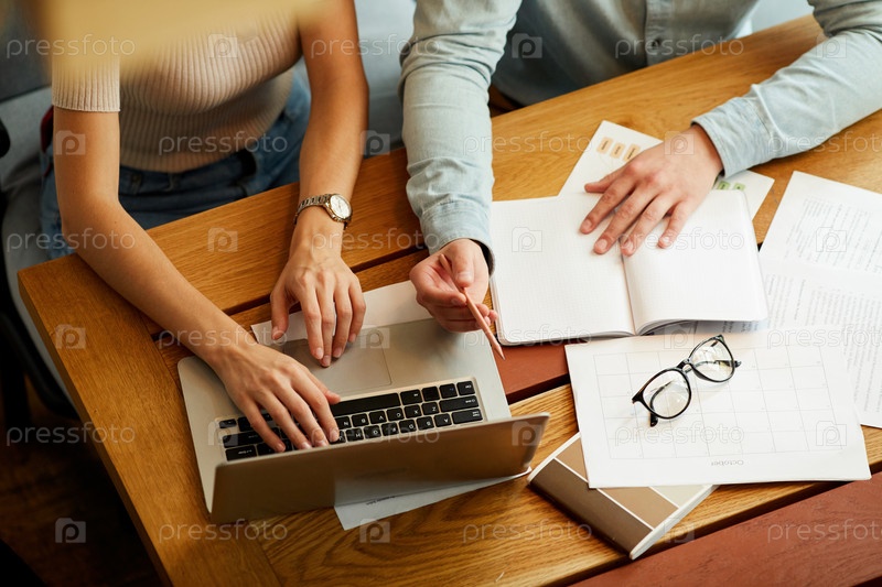 Высокоугольный вид неузнаваемых коллег, сидящих за деревянным столом в офисе и использующих ноутбук и бумаги во время совместного сравнения данных