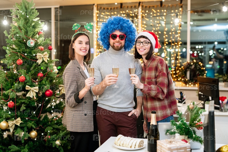 Счастливые молодые бизнесмены, приносящие тосты на Рождество с флейтами шампанского