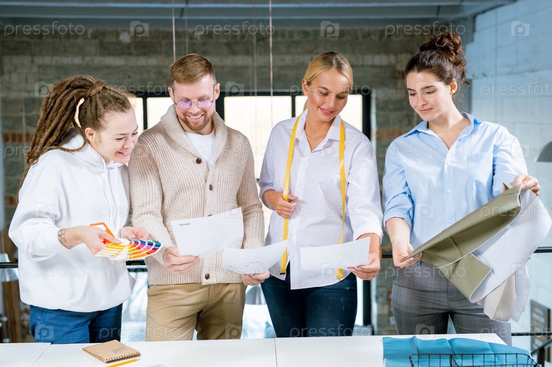 Молодые креативные модные дизайнеры выбирают цвета, текстиль и эскизы