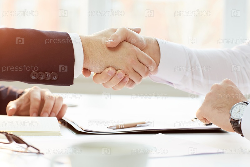 Близкий план неузнаваемого бизнес-исполнителя, сидящего за столом и рукопожатия с деловым партнером после заключения успешной сделки