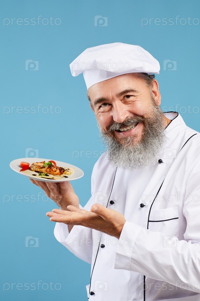 Улыбающийся старший шеф-повар представляет блюдо на синем