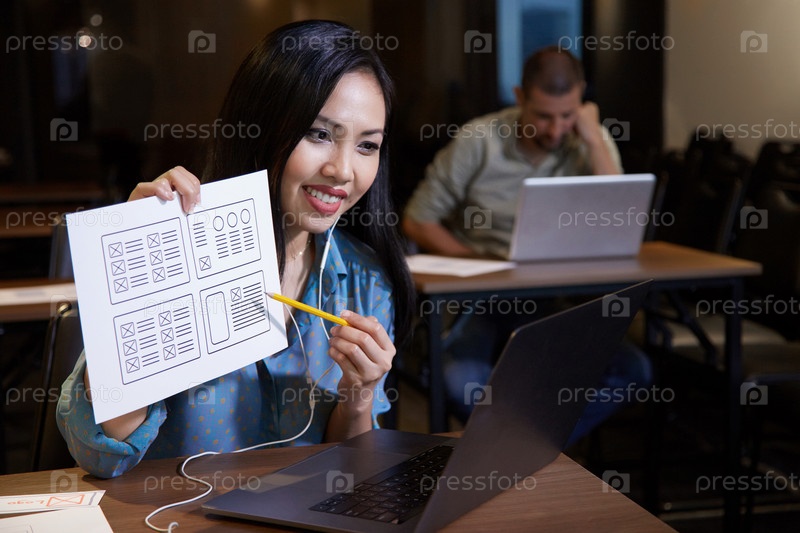 Бизнес-леди показывает шаблон дизайна при видеозвонке