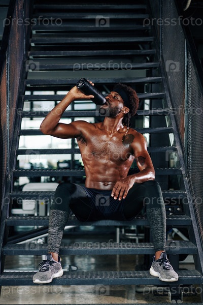 Жаждущий спортсмен сидит на ступеньках