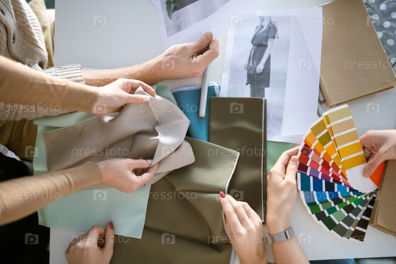 Руки креативных дизайнеров выбирают ткань и цвет для новой модной коллекции