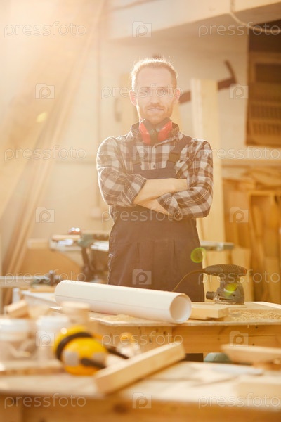 Современный плотник позирует на солнце