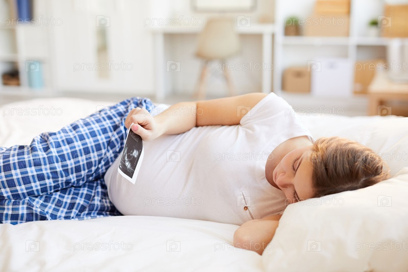 Беременная женщина смотрит на фотографию ребенка