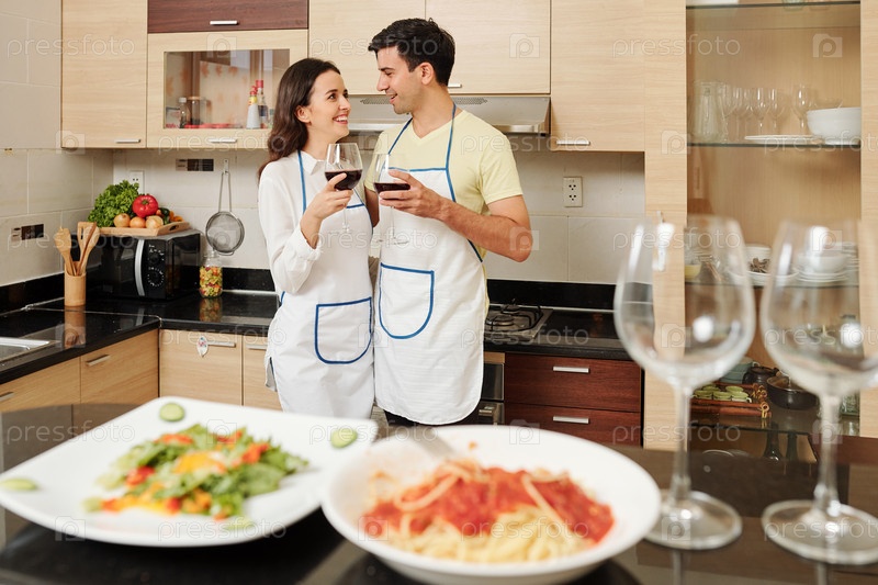 Молодая влюбленная пара стоит на кухне