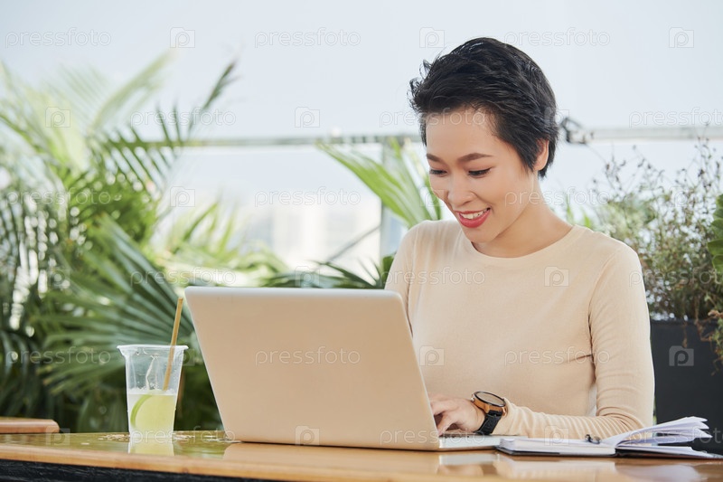 Женщина работает с ноутбуком в кафе