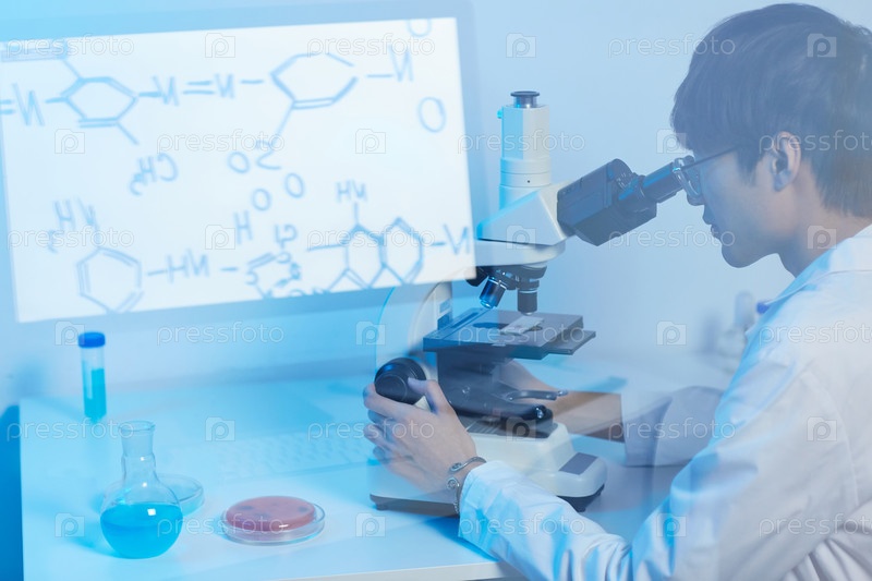 Серьезно ориентированный современный азиатский ученый в очках сидит за столом в лаборатории и использует микроскоп во время изучения молекул