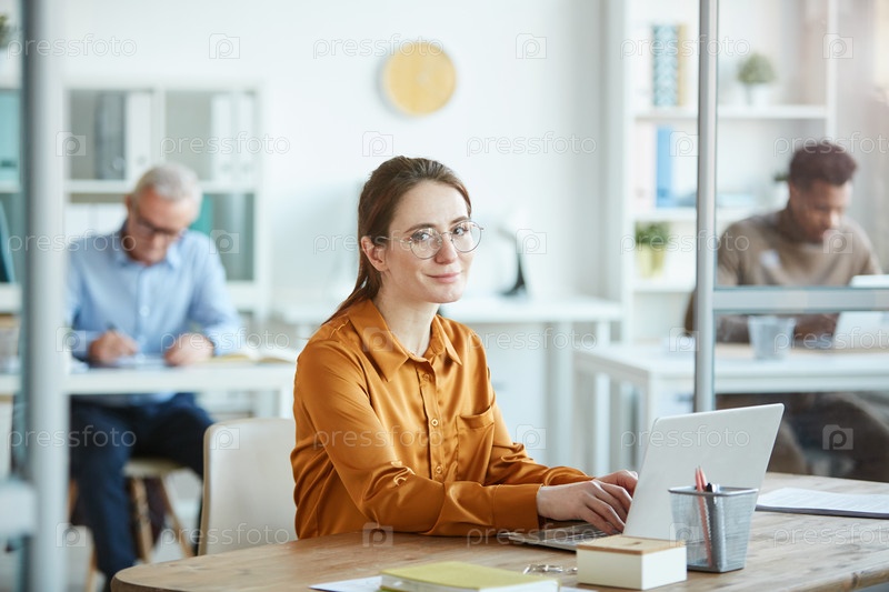 Офисный работник, использующий ноутбук в офисе