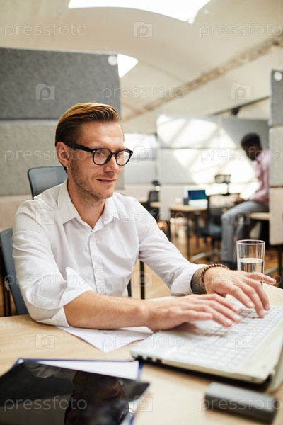 Контент молодой человек в очках сидит за столом и печатает на ноутбуке, работая над статьей для социальных сетей