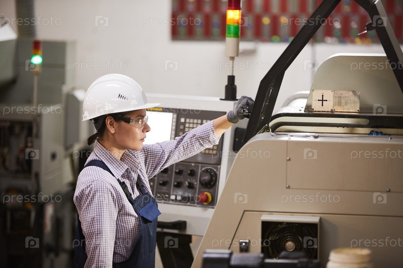 Серьезный опытный оператор женской станковой машины с ЧПУ, стоящий у токарного станка и готовящийся к работе на фабрике