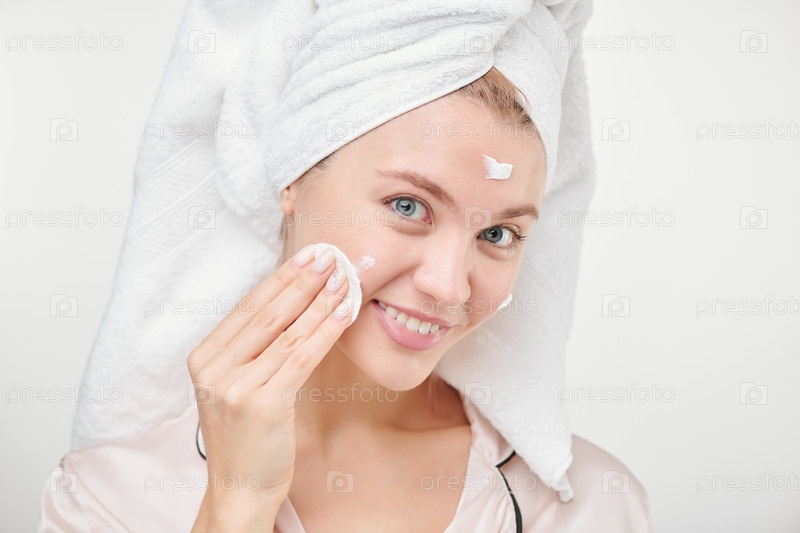 Красивая молодая здоровая женщина, использующая хлопковую подушку для нанесения увлажняющего крема на лицо
