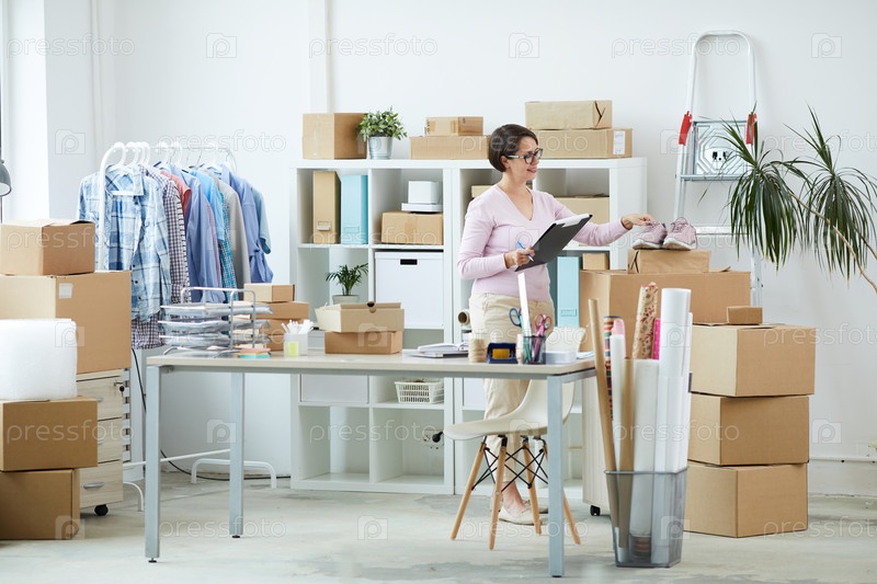 Молодой менеджер интернет-магазина покупает пару розовой обуви