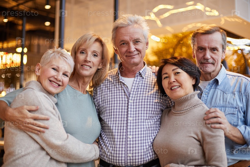 Группа веселых старших многоэтнических друзей обнимают друг друга, позируя вместе для фотографии