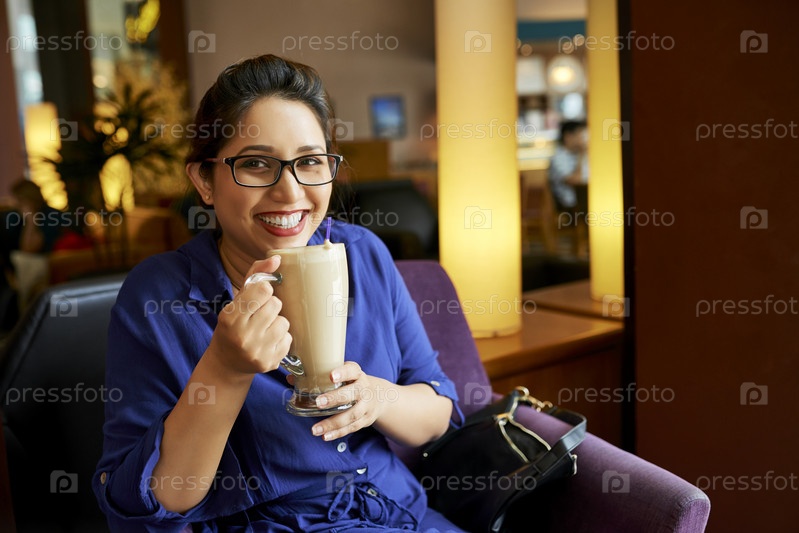 Счастливая женщина пьет кофе