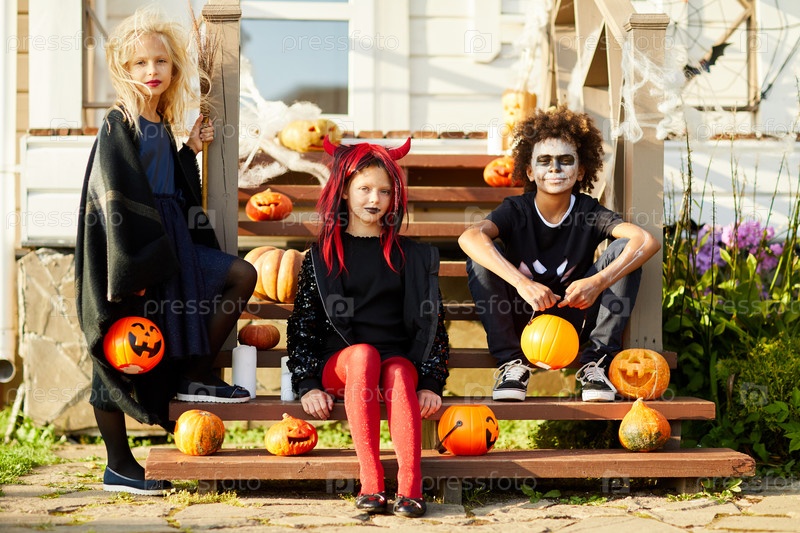 Три ребенка позируют в декорированном доме на Хэллоуин