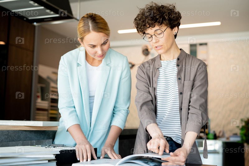 Молодой креативный дизайнер указывает на страницу каталога, помогая клиенту