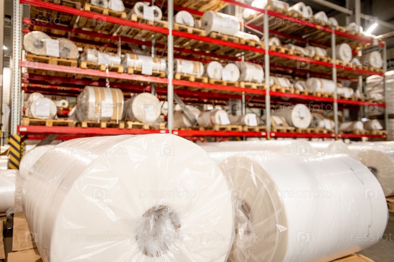Стеллажи прокатаной и упакованной полиэтиленовой пленки в помещении для хранения