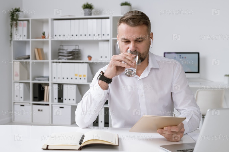 Загруженный зрелый руководитель бизнес-компании пьет воду, используя сенсорную панель