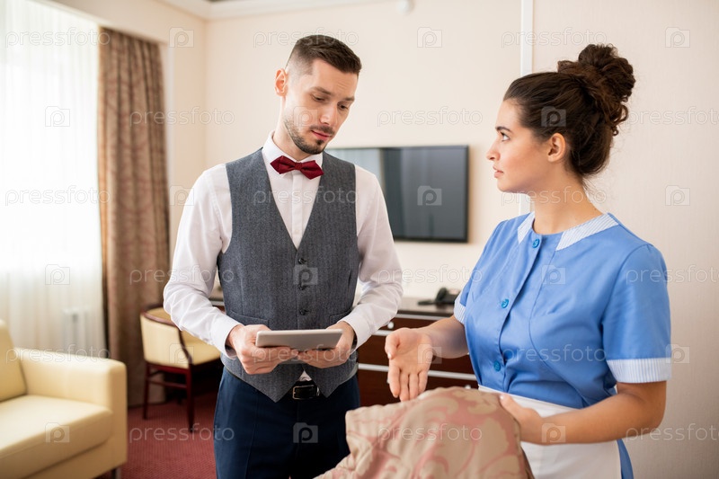 Молодая красивая горничная смотрит на Портера, показывая ему пятно на одеяле