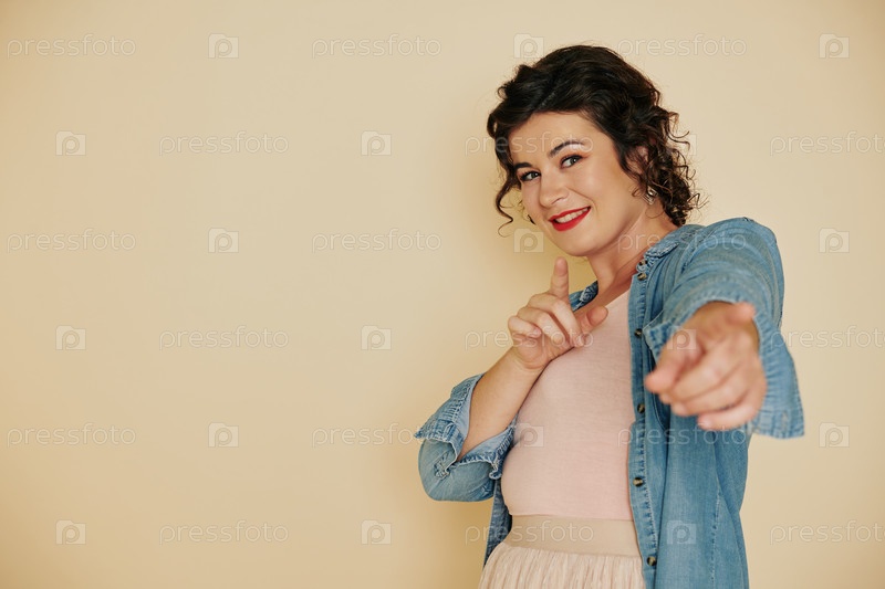 Привлекательная женщина, указывающая на камеру
