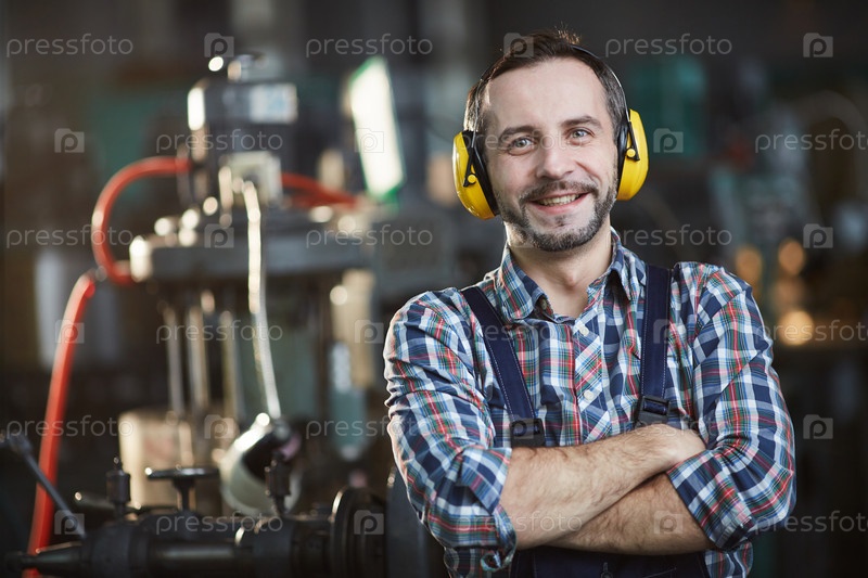 Улыбающийся работник, носящий наушники
