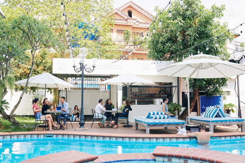 Люди отдыхают у бассейна