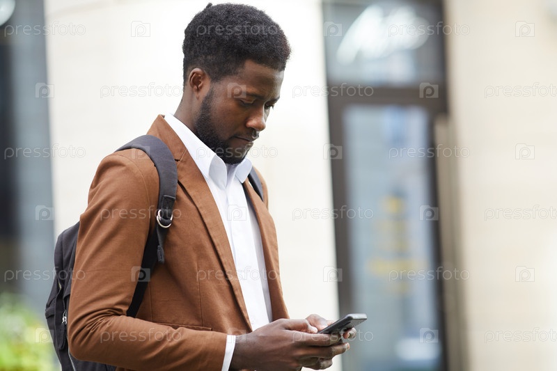 Современный африканский мужчина использует смартфон на открытом воздухе