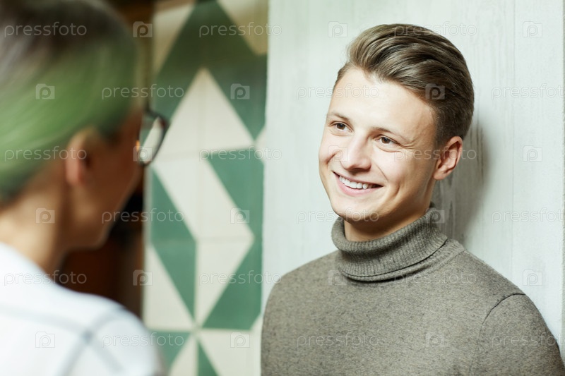 Женщина разговаривает с привлекательным молодым парнем в гардеробе, пока они стоят в современном фойе