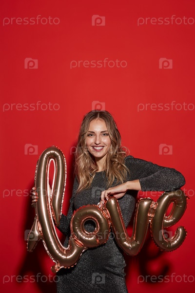 Улыбающаяся молодая женщина держит любовный шар на красном