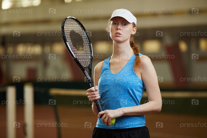 Портрет серьезной уверенной в себе опытной молодой рыжеволосой женщины в теннисном наряде, стоящей на крытом поле и держащей ракетку и мяч