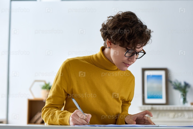 Женщина-хипстерка делает расчеты дома