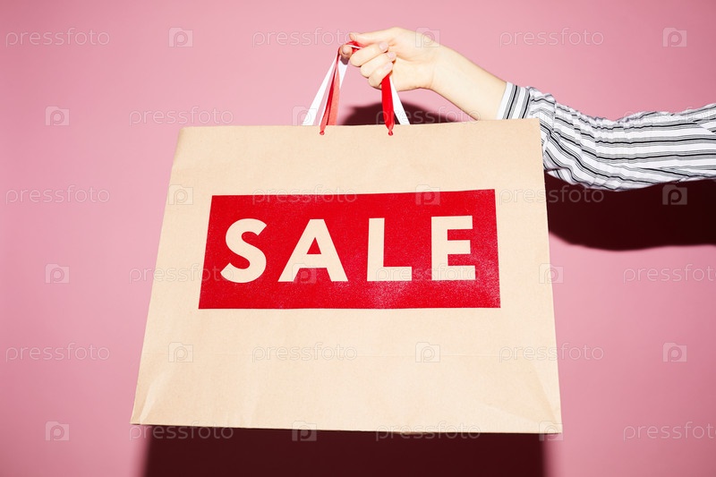 Близкий план неузнаваемой женщины, показывающей сумку с текстом 'Продажа' на розовом фоне