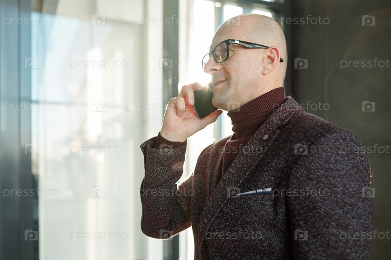 Зрелый бизнесмен в формальной одежде и очках разговаривает по мобильному телефону