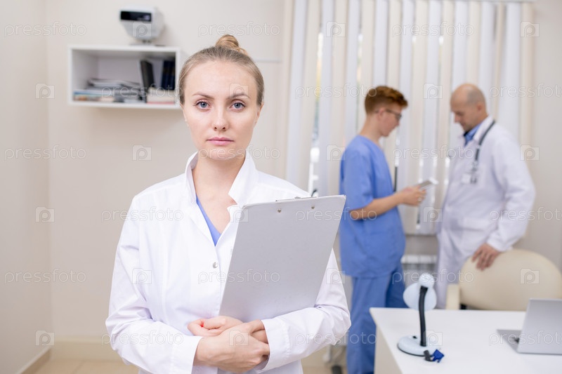 Молодая серьезная блондинка-врач с документом стоит перед камерой